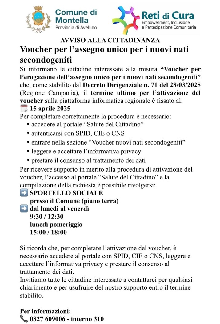 Avviso Voucher per Assegno Unico nuovi nati secondogeniti